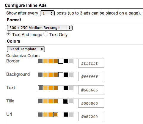 For example, if you want ads to be displayed after every post, select "1" from the drop-down menu (please note that AdSense policy limits you to a total of 3 ad units per page, and Blogger will automatically prevent you from going over this limit). You can then select your ad format and colors. Once you have finished configuring your ads, click on the orange "Save" button.